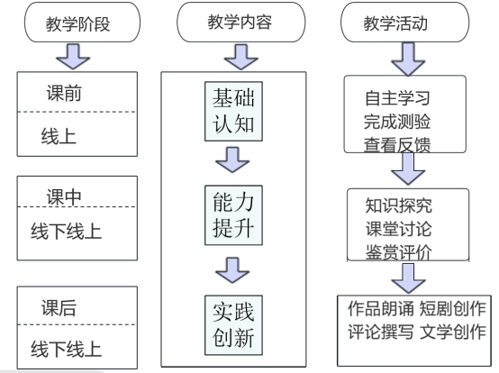 基础认知模块通过线上学习完成,并在超星学习通完成课前测评。教师基于平台数据进行二次备课。能力提升模块在面授课上完成,学生自带设备到教室参与线上线下混合式教学。通过知识探究,课堂讨论,鉴赏评价等活动促进高阶能力的提升。实践创新模块主要在课后和课外完成,包括各项实践应用和创造活动,帮助学生内化知识,提升审美意识和人文素养。