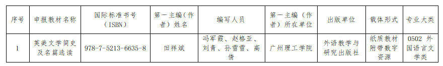 根据《教育部办公厅关于开展普通高等教育本科国家级规划教材推荐工作的通知》、《广东省教育厅关于开展“十四五”普通高等教育本科国家级规划教材第二次推荐遴选工作的通知》安排,学校组织了“十四五”普通高等教育本科国家级规划教材申报工作。经个人申请、二级学院推荐、教务处形式审核、校外专家评审,拟推荐田祥斌教授编著的《英美文学简史及名篇选读》教材参与“十四五”普通高等教育本科国家级规划教材评选,现将推荐教材基本情况公示如下: